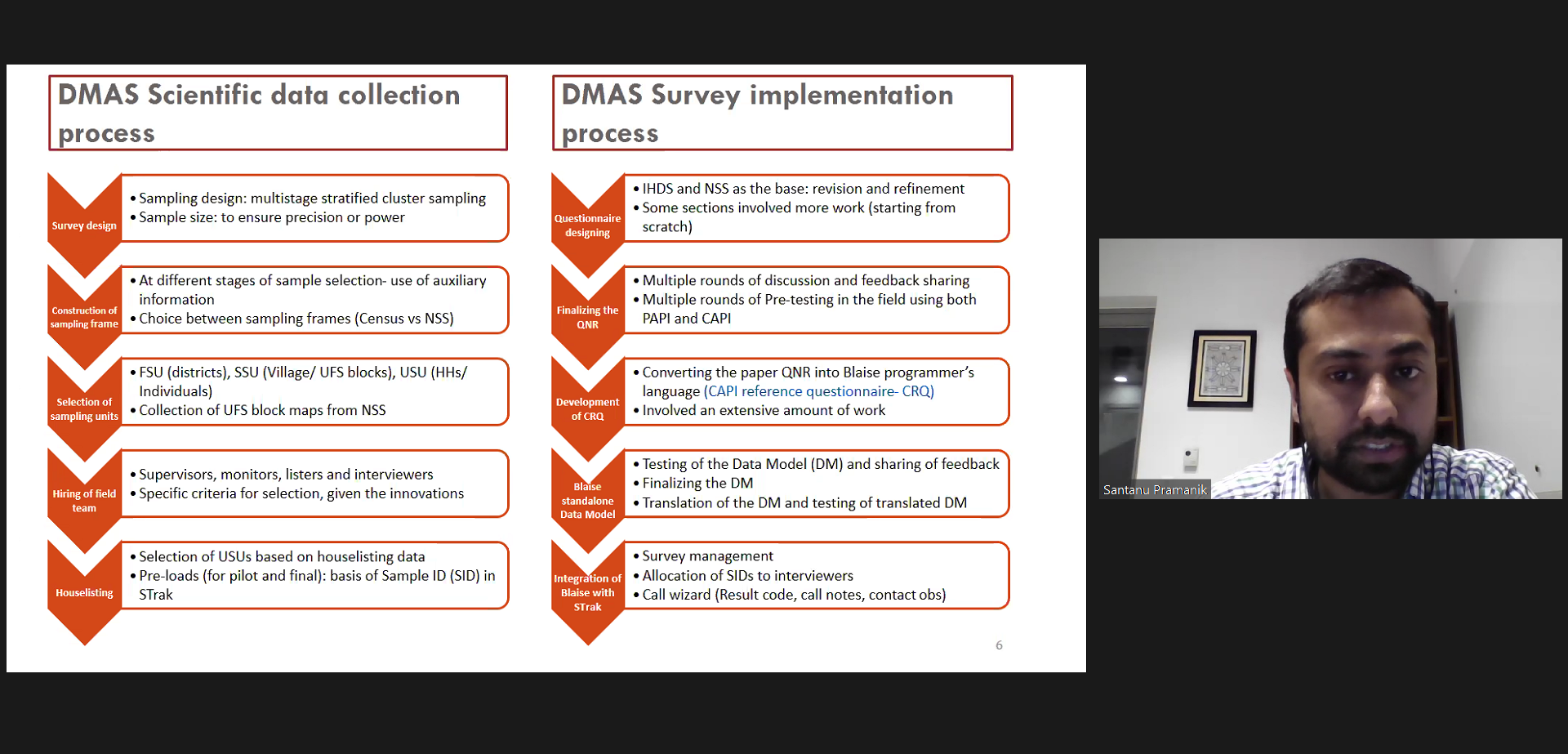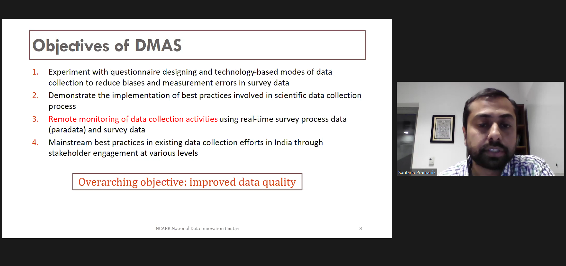 Santanu Pramanik is a Senior Fellow at NCAER and the Deputy Director of the National Data Innovation Centre. He is a Statistician and Survey Methodologist by training. His research interests encompass survey methods, data quality, remote monitoring of data collection activities, randomised controlled trials, small area estimation, and the application of these methods across different substantive domains, including vaccination, health insurance and healthcare expenditure, and family planning. He has earlier worked as a Research Scientist at the Public Health Foundation of India (PHFI), and as a Survey Statistician at National Opinion Research Center, an independent affiliate of the University of Chicago.